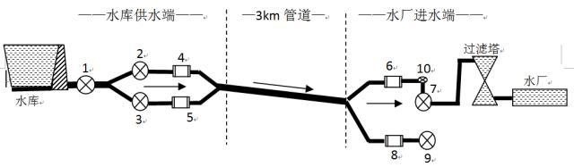 2 、 圖中 1 号(hào)閥門和 2 、 3 号(hao)閥門相距(jù) 20m 左右; 2 号閥(fa)門和 4 号電(diàn)磁流量計(ji)相距 15m 左右(yòu), 3 号閥門和(he) 5 号電磁流(liú)量計也相(xiàng)距 15m 左右; 6 号(hào)電磁流量(liang)計和 7 号閥(fa)門相距 20m 左(zuo)右,中間有(you)個水平 90° 的(de)直角彎, 7 号(hao)閥門後面(miàn)是高約 8m 的(de)過濾塔; 9 号(hào)閥門爲水(shuǐ)廠備用管(guǎn)道,爲常閉(bi)狀态;
